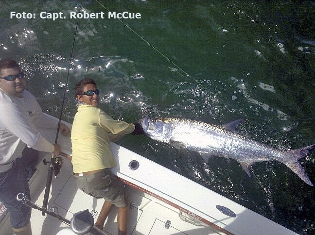 Und auch in Boca Grande ist der Bann gebrochen. Capt. Robert McCue bringt momentan seine Angler täglich in „Körperkontakt“ mit wirklich großen Tarpon. Die Fotos (mit dem Handy aufgenomme) stammen aus den letzten 5 Tagen und zeigen Fische zwischen 80 und 125 lbs.